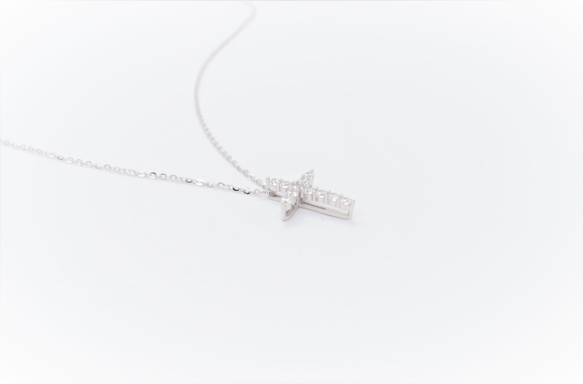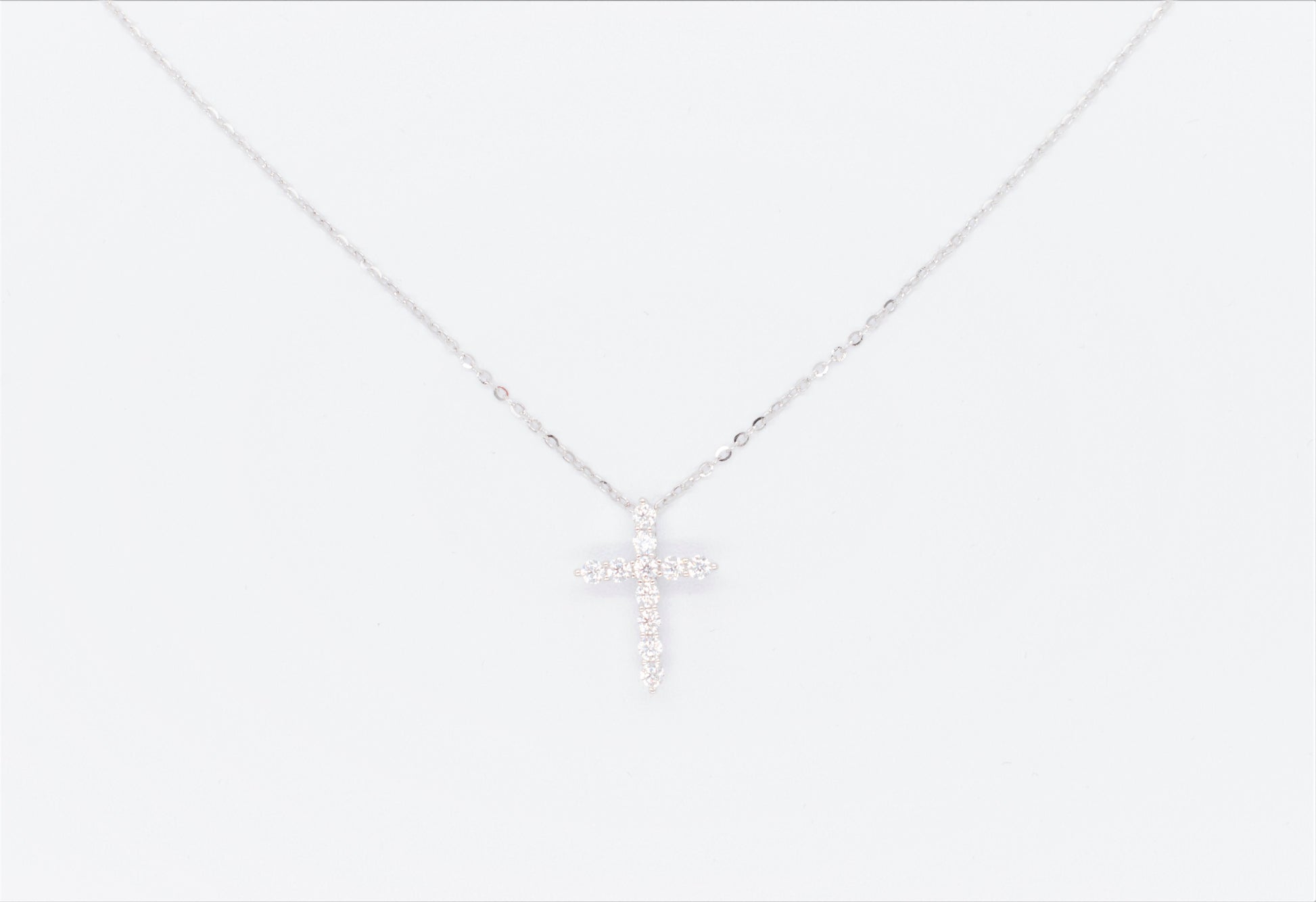 La croce, simbolo di fede e speranza, è impreziosita da piccoli zirconi che ne esaltano la bellezza, conferendo un tocco di brillantezza sofisticata.